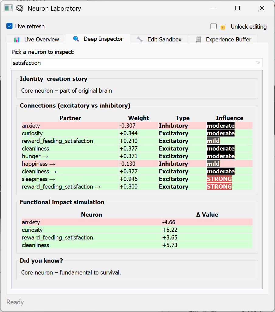 - Tracks various needs like hunger, sleepiness, happiness, and cleanliness.